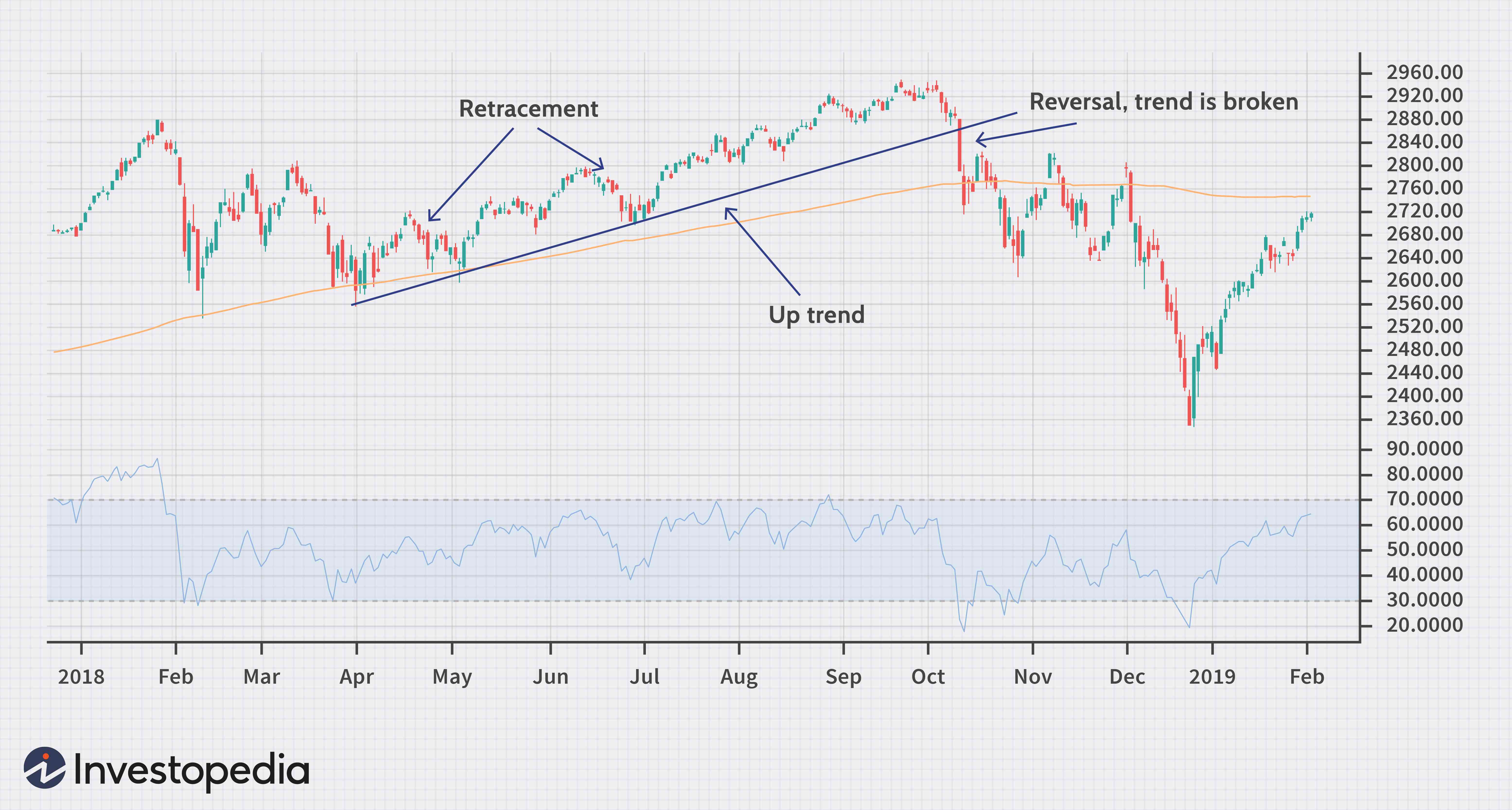 되돌림은 쉽게 반전으로 오인될 수 있기 때문에 식별하기가 쉽지 않다고 할 수 있다. 그래서 많은 투자자들에게 더 나쁘고 위험한 것이 반전을 되돌림으로 오인하는 경우라고 할 수 있다. 아래 차트는 2018년 4월과 10월 사이에 상당한 상승 추세가 있었던 S&P 500 지수를 보여주고 있다.