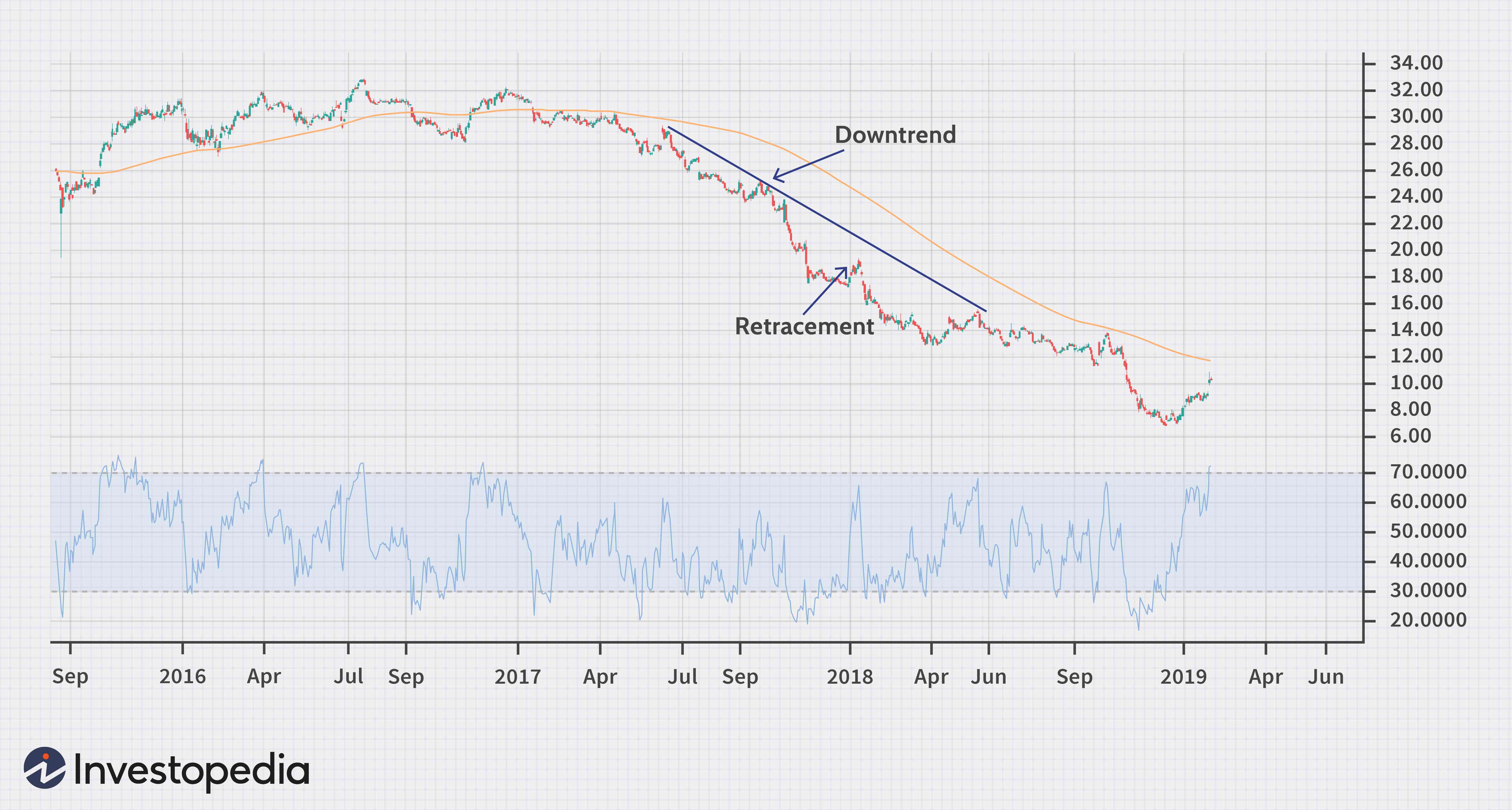 되돌림(retracement)은 주가의 중요한 추세가 일시적으로 반전되는 것을 의미한다. 추세의 반전(reversal)과 구별되는 되돌림은 이전 추세로 돌아가는 추세에 대한 단기 기간의 이동이다. 아래 차트는 GE(General Electric)의 차트로 주가가 하락 추세에 있음을 보여준다. 그러나 이 추세에도 차트에는 가격이 상승하고 있음을 나타내는 점이 있으며 이는 되돌림으로 간주된다.