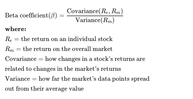 베타는 시장의 변동에 대응하는 유가 증권의 수익 활동을 효과적으로 설명합니다. 유가 증권의 베타는 유가 증권 수익률과 시장 수익률의 공분산 곱을 특정 기간 동안의 시장 수익률 분산으로 나눈 값입니다.