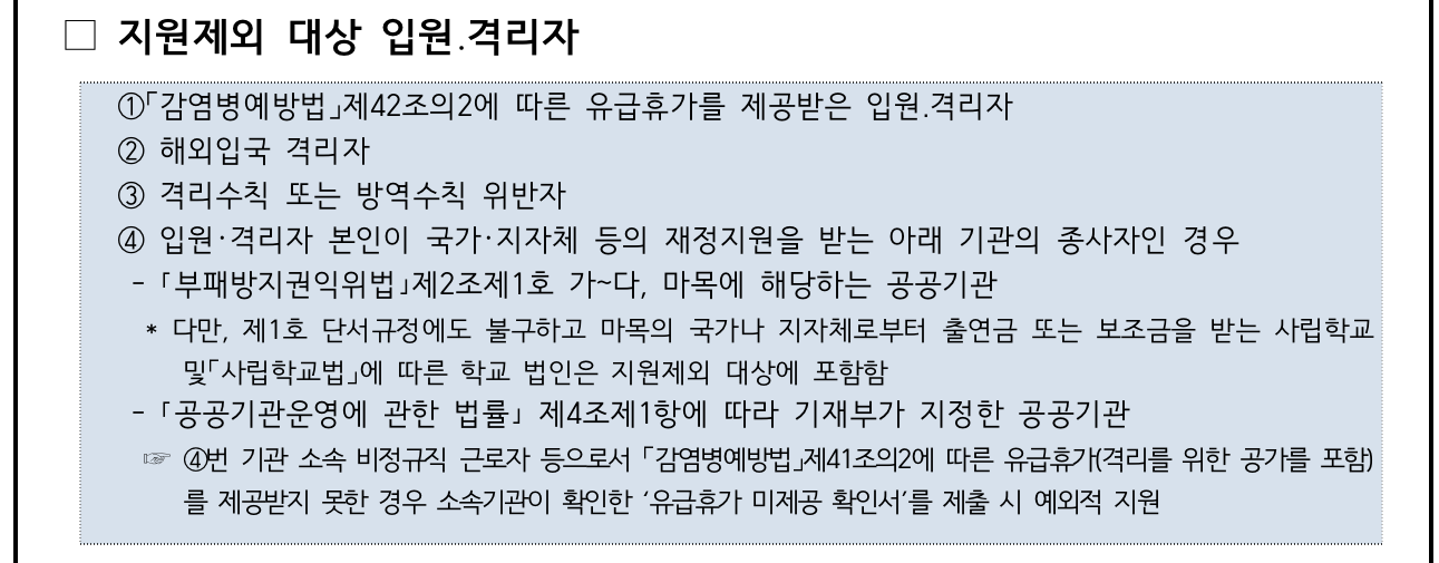 해외에서 입국한 격리자, 격리 수칙 또는 방역 수칙을 위반한 자, 재택근무가 아닌 유급 휴가를 제공받은 입원 또는 격리자, 입원 또는 격리자가 다음의 국가 또는 지자체 등의 재정 지원을 받는 기관에서 종사하는 자