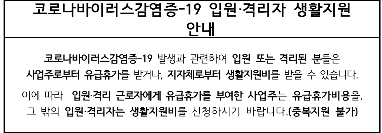 코로나바이러스감염증-19의 발생과 관련하여 자가 격리 또는 입원한 분들은 지자체로부터 생활지원비를 받거나 사업주로부터 유급휴가를 받을 수 있습니다.