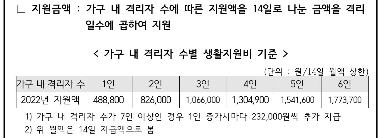 예를 들어 가구내 격리자 수가 2인이고, 10일 동안 격리한 경우 [ 10일 X (826,000원 / 14) ]인 59만 원이 지급됩니다. 보통 7일이 격리되는 데, 이 경우에는 위 표에 기재된 금액을 2로 나누면 됩니다.