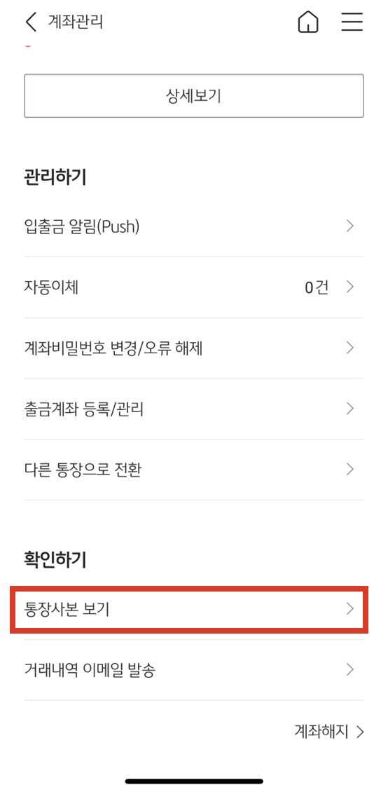 4. 계좌관리 하단 메뉴 중에 '확인하기' 카테고리의 '통장사본 보기'를 선택합니다.