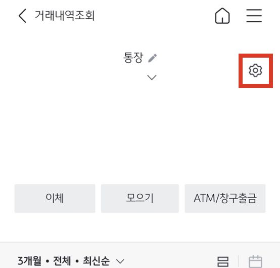 2. 거래내역 조회 화면에서 톱니바퀴 모양을 선택(터치)해 '계좌관리' 화면으로 이동합니다.