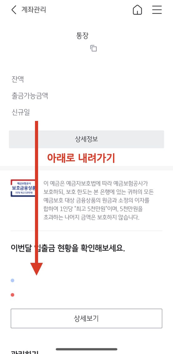 3. 계좌관리 화면에서 화면을 아래로 스크롤하여(손가락으로 화면을 위로 밀어서) 메뉴 하단으로 이동합니다.