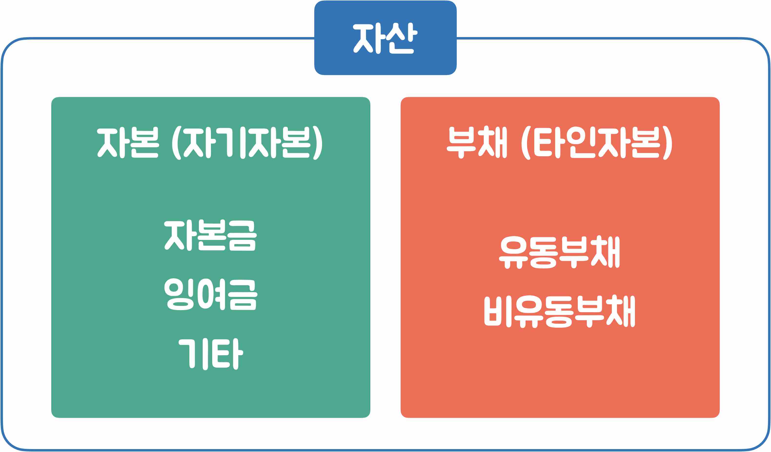 회계에서 자산은 자본(자기자본)과 부채(타인자본)의 합입니다. (자산 = 자본 + 부채) 그리고 자본은 다시 자본금과 잉여금 등으로 나눠집니다.