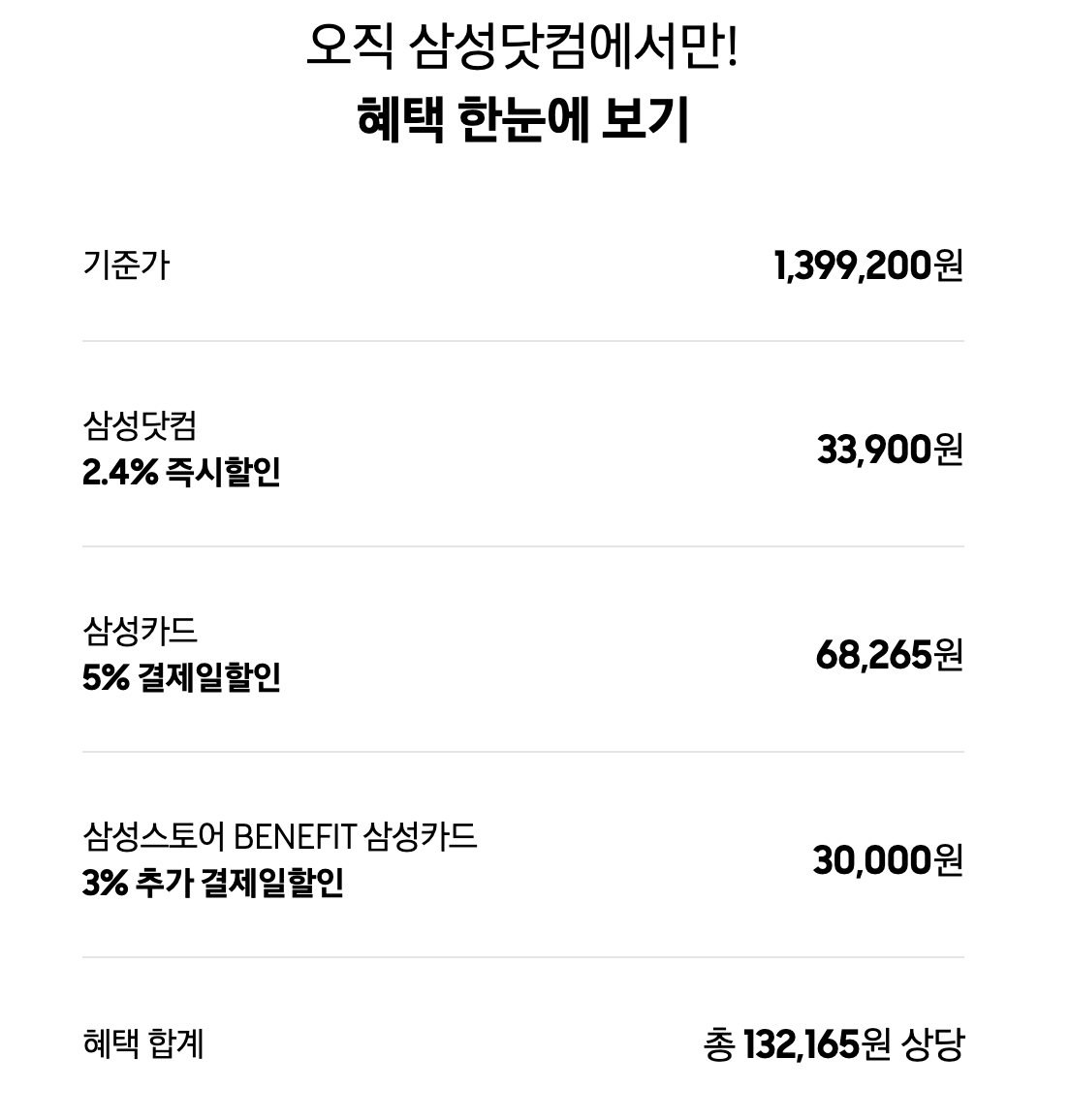 예를 들어 정가가 1,399,200원인 갤럭시 z플립5를 삼성닷컴의 사전예약을 통해 구매하면 삼성닷컴 즉시할인 2.4% 33,900원, 삼성카드 결제일 할인 5% 68,265원, 그리고 삼성스토어 베네핏 삼성카드 3% 추가 할인 30,000원, 합계 132,165원을 추가로 할인받을 수 있습니다.